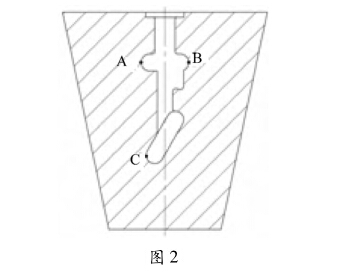 為了保證金屬制件的順利脫模,在高溫條件下, 模具與坯件之間容易產(chǎn)生粘連現(xiàn)象,導(dǎo)致脫模困難, 必須在坯件與模腔表面,涂添潤滑材料,不僅有利于 脫模,也延長模具的使用壽命。但是,潤滑材料與高 溫金屬的接觸,產(chǎn)生一定的氣體,隨著坯料的不斷入 模,模腔的頂端產(chǎn)生越來越大的氣體阻尼,不僅影響 坯料無法到位,也會(huì)因氣體的回流導(dǎo)致氣體隔層的 產(chǎn)生,使金屬難以融合,嚴(yán)重影響質(zhì)量,這種制件內(nèi) 部的質(zhì)量問題往往不易發(fā)現(xiàn)。因此,在紅沖模的設(shè) 計(jì)過程中,根據(jù)經(jīng)驗(yàn),在模具的頂端,特別是輻射狀 接頭的支端思轉(zhuǎn)角處,合理設(shè)計(jì)n個(gè)50 的排氣 孔,將氣排出,減少阻尼,防止氣體和金屬隔層,減少 積炭,如圖2中A、B、C等處,設(shè)計(jì)了排氣孔,制件在 脫模時(shí),減少吸力,避免脫模時(shí)因真空吸力而產(chǎn)生滯 粘現(xiàn)象。