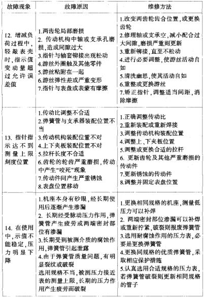 彈簧管式壓力表在使用中,由于振動、腐蝕、磨損、變形、灰塵、油 污等多種原因,使其計量性能發(fā)生變化、損傷精度、產(chǎn)生超差,故障形 式繁多,通常帶有多種故障并存,相互影響,故障分析判斷技術(shù)是調(diào)修 處理的基礎(chǔ),技術(shù)水平高低直接關(guān)系工作效率的髙低。筆者在多年的 工作中對故障判斷及調(diào)修方法進行了匯總,詳見下表。