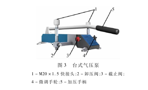 在壓力表檢定過程中,需要有一個穩(wěn)定的壓力提 供源來實現(xiàn)加壓和減壓,本仿真的臺式氣壓泵就是一 個采用壓桿式設計的氣體壓力源。如圖3所示, 臺式氣壓泵由兩個標準的M20 X1.5快接頭、截止閥、 加壓手柄、微調(diào)手輪、壓力真空轉(zhuǎn)換閥、卸壓閥組成。 左側(cè)快接頭安裝精密壓力表標準裝置,右側(cè)快接頭安 裝被檢壓力表,通過按壓加壓手柄實現(xiàn)加壓,微調(diào)手輪 實現(xiàn)對壓力的微調(diào),壓力真空轉(zhuǎn)換閥實現(xiàn)對真空表檢 定和壓力表檢定的轉(zhuǎn)換,卸壓閥用來降壓,截止閥用來 連通和截止氣道。