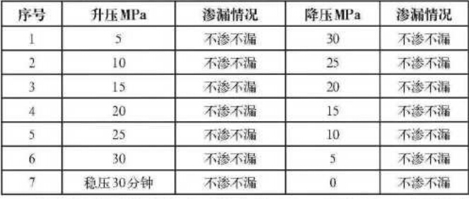 通過(guò)上表可以看出當(dāng)壓力升致30MPa且穩(wěn)壓30分鐘仍表 現(xiàn)為不滲不漏,說(shuō)明了該裝置密封性能和剛壓性能良好。