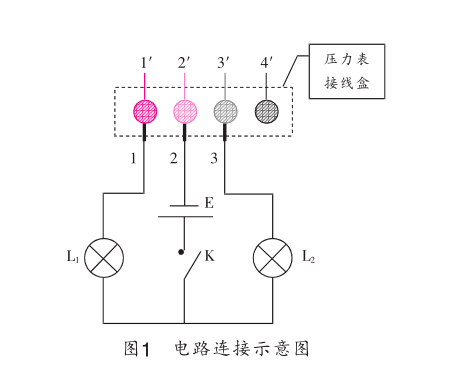 可事先將上述元器件按如圖1所示電路圖連接: 其中L和^為小燈泡,ES干電池(組),K為開(kāi)關(guān)。1、2 和3為3個(gè)預(yù)留接線頭,檢定時(shí)分別與電接點(diǎn)壓力表的 上限接線端(1')、公共端(2,)和下限接線端[3’)相連 接(4’為電接點(diǎn)壓力表的接地端)。
