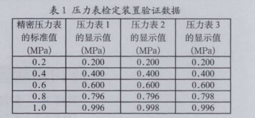 采用測量范圍為(0~2.5) MPa、準(zhǔn)確度等 級為0.25級的精密壓力表同時對3塊性能穩(wěn)定、 測量范圍為(0~ 1) MPa、準(zhǔn)確度等級為1.6級 的壓力表進行校準(zhǔn),校準(zhǔn)結(jié)果的數(shù)據(jù)如表1所示。 從以上的數(shù)據(jù)可得出三個表的測量數(shù)據(jù)相差的數(shù)據(jù)最大只有0.002 MPa,該表的最大允許誤差 為0.016 MPa,不超過該表的最大允許誤差,同時利用公式丨x2-x1丨/x< W U, C/=1.2%,其中;Ci 和x2取壓力表1、壓力表2及壓力表3中的任意兩 組數(shù)值,義為精密壓力表的標(biāo)準(zhǔn)值,均能滿足公式 的要求,同時將三塊壓力表更換接口的位置,得到 的測量數(shù)據(jù)仍然保持不變。從而驗證了該次壓力表 檢定裝置改造后數(shù)據(jù)有效可靠。