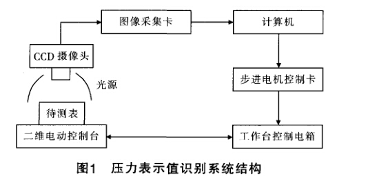 系統(tǒng)結(jié)構(gòu)如圖1所示,待測壓力表安裝在自制的 二維電動工作臺,每次安裝6塊壓力表。工作臺控制電 箱負(fù)責(zé)對表進(jìn)行加壓和減壓。在二維電動控制臺前端 安裝高分辨力的攝像機。攝像機拍攝的壓力表視頻被 安裝在計算機上的圖像采集卡采集。通過在計算機上 編寫智能識別算法,對采集的壓力表圖像自動識別,獲 取指針準(zhǔn)確位置,計算出其指示量值,與標(biāo)準(zhǔn)數(shù)字壓力 表示值進(jìn)行比對,計算出儀表的示值誤差和回程誤差, 將結(jié)果存人數(shù)據(jù)庫。需測量壓力表輕敲后的指針示值 變動量時,步進(jìn)電機控制卡負(fù)責(zé)控制力錘實現(xiàn)對壓力 表表殼的輕敲,從而達(dá)到輕敲位移的檢定要求。