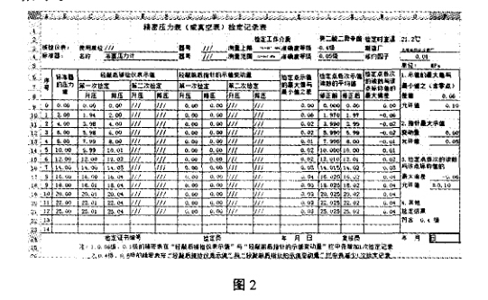 規(guī)程規(guī)定:檢定時(shí)應(yīng)從零點(diǎn)開(kāi)始,應(yīng)平穩(wěn)升壓或降 壓,對(duì)各檢定點(diǎn)進(jìn)行示值檢定。對(duì)每一檢定點(diǎn)在升壓和 降壓時(shí)均應(yīng)進(jìn)行兩次讀數(shù),第一次在輕敲表殼前讀取;第 二次在輕敲表殼后讀取(按分度值的1/10估讀),并將輕 敲后的讀數(shù)及輕敲前后所弓丨起的指針變動(dòng)量分別計(jì)入到 圖 2 中的(C9:C21),(D9:D21),(G9:G21)(H9:H21)單元 格中。