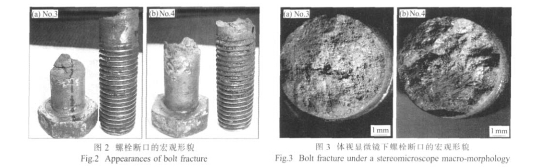 圖2為No.3和No.4螺栓斷口的宏觀形貌,圖3為體視顯微鏡下螺栓斷口的宏觀形貌。從圖2可看出, 斷口為脆性斷裂,沒有明顯的塑性變形。從圖3中可 以清晰地看出,整個(gè)斷口表面都被腐蝕產(chǎn)物(鐵銹 層)所覆蓋。