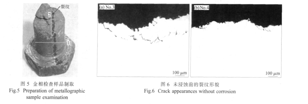金相檢驗(yàn)是斷裂分析中的重要手段。通過金相 檢驗(yàn)可以查明斷裂損壞的原因,例如某些由于材質(zhì) 缺陷或者環(huán)境介質(zhì)等因素所導(dǎo)致的破壞,需要通過 金相檢驗(yàn)來判別損壞的原因。同時(shí),在對(duì)裂紋進(jìn)行檢 查時(shí),裂紋尖端的試樣往往可以提供最有價(jià)值的信 息。這是由于裂紋尖端受環(huán)境介質(zhì)的影響較小,容易 判別裂紋擴(kuò)展路徑的方式。因此,本文中對(duì)斷裂的 螺栓進(jìn)行了金相檢查,如圖5所示,在端口部分沿 線1方向切下,沿線2將斷口表面垂直剖開,可以觀 察到裂紋末端。