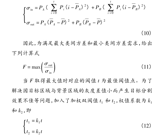 改進(jìn)的OtSU算法可以通過調(diào)節(jié)權(quán)值參數(shù)改變分割效 果,減少了目標(biāo)細(xì)節(jié)在分割中遺失的情況發(fā)生[13]。