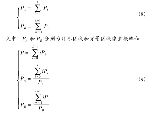 設(shè)待處理圖像有L個(gè)灰度級(jí),目標(biāo)區(qū)域4和背景區(qū)域 B由閾值t區(qū)分,Pi為圖像中灰度級(jí)為i的像素出現(xiàn)概率
