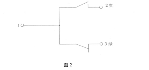 在普通彈簧管壓力表上加裝一套上下限電接點(diǎn)裝 置,即構(gòu)成電接點(diǎn)壓力表,它能夠在設(shè)備達(dá)到控制極限壓 力時(shí)發(fā)出報(bào)警信號(hào)。如圖1所示,這是直接作用式電接 點(diǎn)壓力表示意圖。電接點(diǎn)壓力表除壓力指針外,另有兩 根上下限控制指針,分別用來(lái)控制壓力的上下限值。通 常下限控制指針一般為綠色,上限控制指針為紅色,轉(zhuǎn)動(dòng) 安在玻璃蓋外面的旋鈕,可以把兩個(gè)控制指針撥動(dòng),固定 在所需壓力的刻度位置上。在控制指針上裝有絕緣柱, 分別借助游絲的反力矩與靜觸頭的金屬桿接觸。壓力表 指示指針和控制指針?lè)謩e裝有觸頭,二觸頭相互絕緣,壓力表外側(cè)有電I器接線端子盒,壓力表內(nèi)角頭 有三艮引線,分別接在電器接線端子盒內(nèi)。用萬(wàn)用表分別測(cè)量 這三根引線,很容易得出這三根接線之間的相互關(guān)系,用 簡(jiǎn)圖表示如圖2。