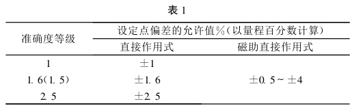 此時(shí),大家要注意,表1中提到兩種作用方式,即直 接作用式和磁助直接作用式,兩者的偏差允許值是不同 的,一般在電接點(diǎn)壓力表上都會(huì)注明作用的形式,在檢定 時(shí)大家要注意看表盤(pán),以免誤判。再做切換差的檢定,壓力表從大于上限指示的壓力開(kāi)始降壓,同樣快到達(dá) 上限設(shè)定值時(shí),改用手輪減壓,當(dāng)萬(wàn)用表的鳴叫聲一斷, 這就是在上限值時(shí)的斷開(kāi)壓力值。繼續(xù)降壓,當(dāng)接近下 限指針設(shè)定的值時(shí),也同樣改為手輪降壓,當(dāng)萬(wàn)用表鳴叫 的一瞬間的壓力值,即為接通壓力值。現(xiàn)在我們得到了 上下設(shè)定點(diǎn)的接通和斷開(kāi)的實(shí)際壓力值,根據(jù)切換差的 定義來(lái)計(jì)算實(shí)際壓力值之差,來(lái)確定是否滿(mǎn)足規(guī)程的要 求,從而做出壓力表合格與否的判斷(在這里同樣要注意 直接作用式和磁助直接作用式的允許值得區(qū)別)。