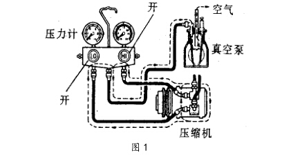 測量前先將壓力表組的高低壓手動(dòng)閥關(guān)閉,然后將壓力表組 的高低壓軟管分別連接于壓縮機(jī)相應(yīng)的檢修閥上(如圖1),并利 用制冷劑本身壓力排除管內(nèi)空氣。開啟空調(diào)機(jī),這時(shí)高壓表指針 慢慢上升,低壓表指針慢慢下降,穩(wěn)定后即可讀出壓力值。