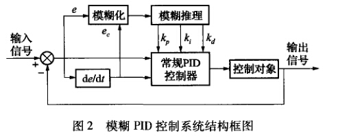 模糊PID控制是以模糊集合論,模糊語言變量 和模糊邏輯推理為基礎(chǔ)的一種數(shù)字控制,它以誤差 e和誤差變化ec作為輸入,利用模糊控制規(guī)則在線 對PID參數(shù)進行修改,以滿足不同誤差e和誤差變 化e。對控制參數(shù)的不同要求,使被控對象有良好的 動、靜態(tài)性能。模糊PID控制系統(tǒng)結(jié)構(gòu)框圖如圖2 所示。
