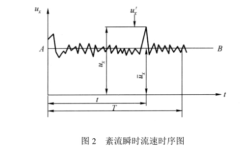 故有:Ux = Ux + Ux 式中:Ux為瞬時(shí)流速;U X為該點(diǎn)在X方向的脈動(dòng)流 速,隨時(shí)間變化;Ux為該點(diǎn)x方向的時(shí)均流速,從圖 形上看,Ux是T時(shí)段內(nèi)與時(shí)間軸平行的直線AB的縱坐標(biāo)。