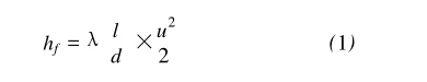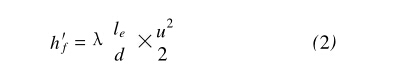 式中:hf為流體在長(zhǎng)度為l的一段圓直管線中的流 動(dòng)阻力;A為流體的摩擦系數(shù);1為管線長(zhǎng)度為 管線直徑;U2為流體流動(dòng)速度。