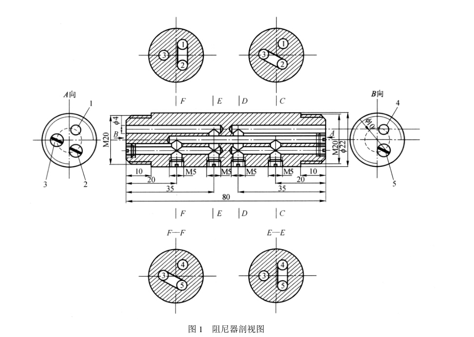力口工方法:以安裝在接頭直徑為<22的壓力表 上長(zhǎng)為80mm的阻尼器為例。其剖視圖如圖1所 示。在端面A上按等邊三角形的三個(gè)頂點(diǎn)位置鉆 三個(gè)直徑約4mm的孔1、、,孔1、深約35mm,孔 3深約60 mm ;在棒的另一端面B上,對(duì)應(yīng)孔1、的 位置鉆相同孔徑的圓孔4、,深約35mm;在距4端 面約20mm處的側(cè)面鉆孔將孔2、溝通,在距4端 面35mm的側(cè)面鉆孔,將1、溝通;同理,在距B端 面20mm的側(cè)面鉆孔,將3、5溝通,在距B端面 35mm的側(cè)面鉆孔,將4、溝通。然后再堵上所有 的側(cè)面孔及孔2、、,再在其兩頭套扣之后,便制成 了簡(jiǎn)易的阻尼器。將其安裝在泵出口管線與壓力表 接頭之間即可。