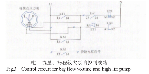 為解決此問(wèn)題,可將KA2更換為時(shí)間繼電器,見(jiàn) 3,使b-c接點(diǎn)接通時(shí)延時(shí)Us停泵,有效消除起泵 時(shí)管網(wǎng)的壓力波動(dòng)。另外,電接點(diǎn)壓力表應(yīng)盡可能遠(yuǎn) 離水泵安裝,這樣也可以減小泵本體振動(dòng)及啟停時(shí)管 網(wǎng)壓力波動(dòng)對(duì)電接點(diǎn)壓力表接點(diǎn)通斷的影響。