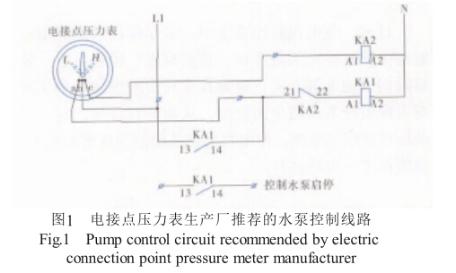 給水系統(tǒng)中的定壓系統(tǒng)是保持管網(wǎng)壓力恒定在一 定的范圍內(nèi),當(dāng)管網(wǎng)壓力低于某值時(shí)啟動(dòng)水泵加壓, 當(dāng)管網(wǎng)壓力達(dá)到一定值時(shí)停泵,如此循環(huán)。實(shí)現(xiàn)此功 能的測(cè)壓元件是電接點(diǎn)壓力表。電接點(diǎn)壓力表一般由 導(dǎo)壓系統(tǒng)包括接頭、洋簧管等)、齒輪傳動(dòng)機(jī)構(gòu)、示 數(shù)裝置包括指針與度盤(pán))、電接點(diǎn)裝置、外殼包括 表殼、表蓋、密封墊圈、表玻璃等)、設(shè)定裝置和接線 插頭座等組成,外殼一般為氣密型結(jié)構(gòu)。其集壓力顯 示與控制于一起,設(shè)定調(diào)整方便。但電接點(diǎn)壓力表應(yīng) 用在管網(wǎng)定壓系統(tǒng)中,下述問(wèn)題不可避免會(huì)遇到,設(shè) 計(jì)控制線路時(shí)如不采取一定措施,無(wú)法保證安全、穩(wěn) 定運(yùn)行。一般設(shè)計(jì)的水泵控制線路如圖1所示。但應(yīng)用 到管網(wǎng)定壓系統(tǒng)時(shí)會(huì)存在以下問(wèn)題。