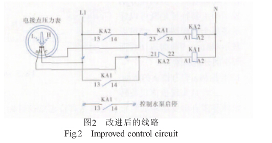 為了克服上述缺點(diǎn),可按圖2修改原理圖。在接點(diǎn) b- c間增加閉鎖接點(diǎn),一旦電接點(diǎn)壓力表指針碰上高 位接點(diǎn),KA2中間繼電器立即閉鎖,消除了接點(diǎn)b-c 的抖動(dòng)。同時(shí)為了能保證管網(wǎng)壓力到達(dá)低限時(shí)a-b 點(diǎn)能啟泵,將KA1的常開(kāi)接點(diǎn)串入本回路,見(jiàn)圖2。 修改后的接線可以很好地消除管網(wǎng)壓力升至上限值 時(shí),接點(diǎn)b-c抖動(dòng)而引起的接觸器跳躍現(xiàn)象。此接線 己在幾個(gè)工程運(yùn)行數(shù)年,實(shí)踐證明很可靠。
