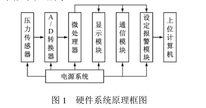 硬件系統(tǒng)由微處理器、壓力傳感器、A/D轉(zhuǎn)換 器、顯示、通信、設(shè)定報警等模塊組成。硬件系統(tǒng)原 理框圖如圖1所示。