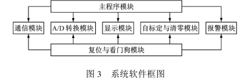 系統(tǒng)軟件主要包括主程序、通信、A/ D轉(zhuǎn)換、顯 示、自標(biāo)定和清零、復(fù)位與看門狗以及報警7個主要 模塊。系統(tǒng)軟件框圖如圖3所示。