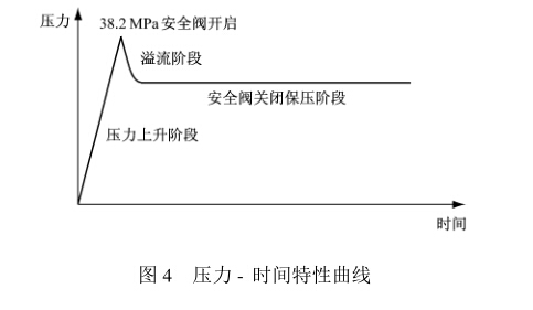 特性曲線的檢測過程:首先開啟試驗臺壓力系 統(tǒng),加壓到38. 2 MPa額定壓力并保持,調(diào)整三用 閥,使其打開在溢流狀態(tài),通過流量檢測儀調(diào)整流量 在90?110 mL/min之間。此時關(guān)閉試驗臺動力使 整個系統(tǒng)處于密封狀態(tài),這時三用閥從開啟狀態(tài)逐 步到關(guān)閉密封狀態(tài),關(guān)閉后壓力要保持不變。壓力 表上顯示三用閥上壓力的變化情況,并且不斷地把 數(shù)據(jù)傳送到計算機,計算機根據(jù)這些數(shù)據(jù),畫出壓力 -時間特性曲線。對于合格的三用閥,開啟后壓力 下降不應(yīng)超過額定壓力的15%,也就是關(guān)閉壓力不 小于32.5 MPa。當(dāng)壓力小于這一值時,設(shè)定自動報 警,圖4為壓力-時間特性曲線圖。