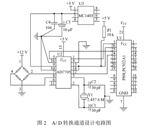 2 - A式A/D轉(zhuǎn)換器,它釆用三線串行接口,能大大 節(jié)省單片機的口線。該轉(zhuǎn)換器包括由緩沖器和增益 可編程放大器組成的前端模擬調(diào)節(jié)電路,能直接轉(zhuǎn) 換傳感器測量到的微小信號;具有高分辨率、寬動態(tài) 范圍、自校準(zhǔn)、優(yōu)良的抗噪聲性能,能達(dá)到0. 003 %非 線性的16位無誤碼數(shù)據(jù)輸出;16位數(shù)字量,基準(zhǔn)電 壓選擇為2. 5 V ,供電電壓為5 V時,滿量程輸入為 2. 5 mV ,其增益和數(shù)據(jù)輸出更新率均可編程設(shè)定, 非常適合儀表測量、工業(yè)控制等領(lǐng)域的應(yīng)用。圖2 為A/D轉(zhuǎn)換通道設(shè)計電路圖。