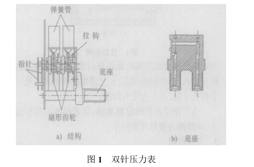 雙針壓力表是用于檢測、顯示汽車在工作狀況時前 制動器儲氣罐和后制動器儲氣罐內(nèi)氣體壓力的壓力表, 其結(jié)構(gòu)如圖1a所示。將汽車上前制動器儲氣罐和后制 動器儲氣罐分別與雙針壓力表底座的兩螺紋接口相接, 儲氣罐內(nèi)高壓氣體分別進入壓力表的圓形彈簧管,圓形 彈簧管在氣體壓力作用下產(chǎn)生變形,從而通過拉鉤拉動 扇形齒輪擺動,扇形齒輪又驅(qū)動針軸齒輪轉(zhuǎn)動,指針也 隨之擺動。壓力表的結(jié)構(gòu)原理決定了壓力表機芯部分 (彈簧管)要求有很好的密封性,不允許有泄漏,否則,若 有微量泄漏,隨著長時間使用,壓力表內(nèi)將充滿各類介 質(zhì)而影響壓力表的使用。為保證壓力表的產(chǎn)品質(zhì)量,對 產(chǎn)品工藝過程需進行密封性檢測。其氣動密封性檢測 系統(tǒng)的設計在《液壓與氣動》雜志2005年第7期上已作 介紹?,F(xiàn)介紹其氣動夾具的設計。