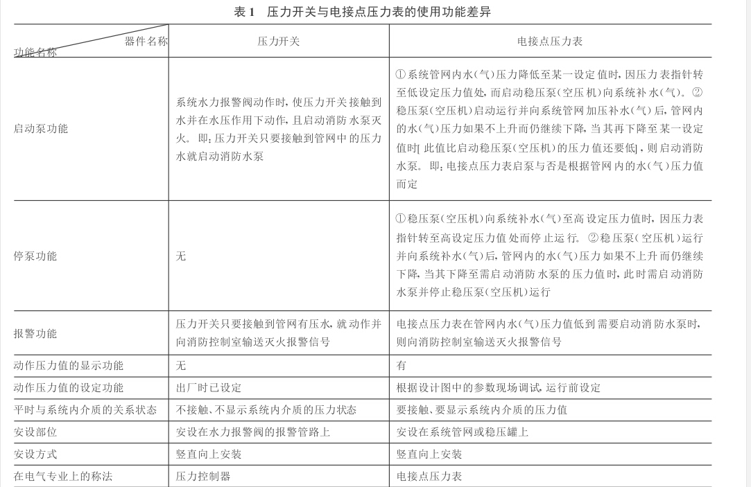 筆者近年來通過對消火栓和濕式自動噴水滅火系 統(tǒng)的穩(wěn)壓系統(tǒng)以及預(yù)作用滅火系統(tǒng)、水噴霧滅火系統(tǒng) 的施工和調(diào)試,經(jīng)常會遇到一些設(shè)計人員誤將壓力開 關(guān)與電接點壓力表混為一談,以至于系統(tǒng)無法調(diào)試^ 究其原因,主要是滅火系統(tǒng)的設(shè)計人員對這兩個器件 的電氣動作原理不熟悉所致。為此,筆者根據(jù)施工調(diào) 試中遇到的問題并查找了有關(guān)資料寫出本文,以饗各 位同行。