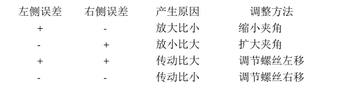 2.3示值前后快慢不同時,應改變連桿與扇形齒輪間的夾 角,當刻度點示值出現全快或全慢時,再調整移動示值的調節(jié) 螺釘即可。通過改變連桿與扇形齒輪的夾角和調節(jié)螺釘兩者 相互補充,就可解決示值前后快慢不均的問題。