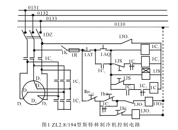 彈簧管式電接點壓力表作為指示、控制 儀表廣泛用于自動對壓力進行區(qū)間控制的場 合。測量ZL2.8/194型斯特林制冷機四個缸平 均工作壓力的壓力表中,有一個YX-150型電 接點壓力表。利用表內上限可調電觸頭,控制 制冷機平均工作壓力的上限+值(2.7MPa)。正 常工作時,壓力表指針位于電觸點下面,當制 冷機因某種原因平均工作壓力超過額定值 時,壓力表指針與上限電觸頭相碰,電路接 通,通過控制電路切斷電機電源,制冷機停止 運轉[1]。圖1為制冷機控制電路原理圖。圖中, 交流接觸器型號是CJO-75TH, 1JS型號為SJS-5的時間繼電器,1hs1—4表示4 只水量訊號裝置行程開關串聯在一起,1hu代 表油壓訊號裝置行程開關,1hj表示電接點式 壓力表的電觸頭,1JOjD1JO2S兩個中間繼電 器,型號是JZ7-44TH。