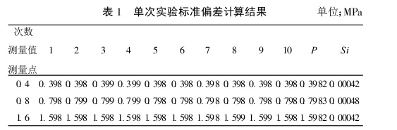把1. 6 MPa 0.4級彈簧管式壓力表在0. 4 MPa、 0. 8MPa、1. 6MPa重復性條件下分別測量10次,獲得3組 測量列,具體數(shù)字見表1。