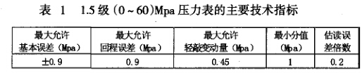(一)1.5級(0~60)Mpa壓力表的主要技術指標(見表1)