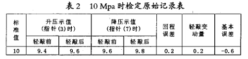 1.由表2可判知,在被檢標定值lOMpa時: