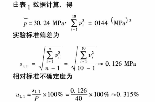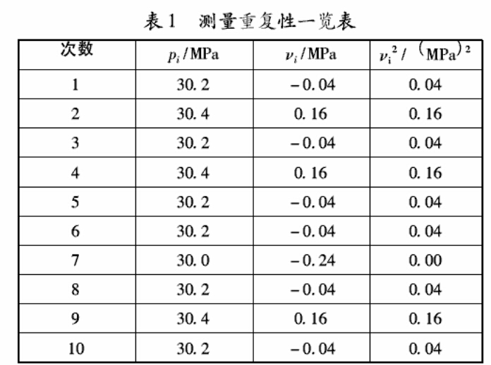 值誤差最大點(diǎn)30 Mpa,在該點(diǎn)重復(fù)測量10次,以該點(diǎn)的 測量重復(fù)性來估算其相對標(biāo)準(zhǔn)不確定度。如表1所示。