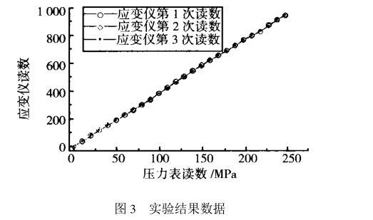本次試驗采用的壓力表精度等級為2. 5 ,量 程250 MPa.溫度為室溫20 ±3 C.應(yīng)變片接入方 法為3.3.2中的接入方法,即采用一個工作片和 一個溫度補(bǔ)償片的方式.本次試驗共重復(fù)進(jìn)行了 3次,3組數(shù)據(jù)如圖3所示.由圖3可以看出管壁 的伸縮變化率與管內(nèi)壓強(qiáng)呈線性變化,且數(shù)據(jù)具 有良好的重復(fù)性.本測試受條件限制未使用高精 度的壓力表,并且應(yīng)變片敏感柵尺寸過大,使得實 驗結(jié)果的精度受到一定影響.
