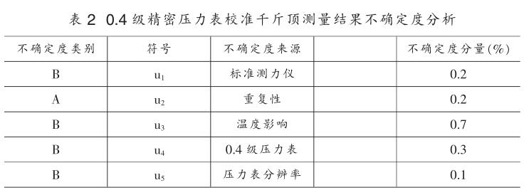 在校準(zhǔn)過程中,測(cè)量結(jié)果的不確定度主要來自以下幾個(gè)方面: (詳見表2)。壓力表精度等級(jí)引入的不確定分量為u4。壓力表分辨率 引入的不確定度u5。測(cè)量結(jié)果的不確定度的影響如見表2。0.4級(jí)精 密壓力表測(cè)量范圍(0~100)MPa和分辨力為0.05MPa,在30弋室溫條 件下,對(duì)測(cè)量結(jié)果的不確定度分析。
