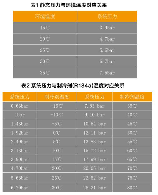 高壓側(cè)壓力與冷凝器的冷凝能力及冷凝器中的制冷劑存儲量 密切相關(guān)。如冷凝能力提高,制冷劑迅速從氣態(tài)冷凝成液態(tài),相 應(yīng)的高壓側(cè)壓力就會降低。如果冷凝器內(nèi)制冷劑存量增加,將會 導(dǎo)致壓力升高。另外,我們還要了解系統(tǒng)靜態(tài)壓力與環(huán)境溫度的 對應(yīng)關(guān)系(表1),以及系統(tǒng)在不同壓力狀態(tài)下,所對應(yīng)的制冷劑溫 度(表2)。系統(tǒng)靜態(tài)壓力是未開空調(diào)時(shí)所測得的壓力,制冷劑溫度 與壓力對比可通過壓力表間接判斷(見表1、2)。壓縮機(jī)工作溫度 在65C至80C之間,冷凝器溫度在55C至70C之間,蒸發(fā)箱由 約55C將至-7C。