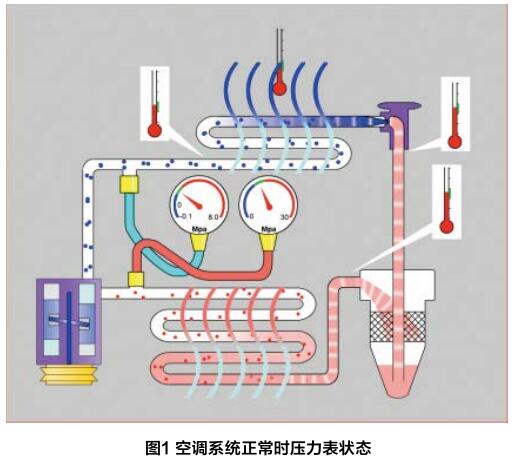 當(dāng)然,所有這些的前提是,我們必須深刻了解管路壓力所代 表的深刻真正含義,只有這樣,才能通過檢測得到的管路壓力來進(jìn)行精準(zhǔn)判斷,否則管路壓力檢測工作就毫無意義。為此,筆者 借助工作實(shí)踐,對空調(diào)管路壓力檢測的幾種情形及對應(yīng)的故障, 進(jìn)行了系統(tǒng)梳理和總結(jié),供汽修同仁們在維修空調(diào)時(shí)參考。