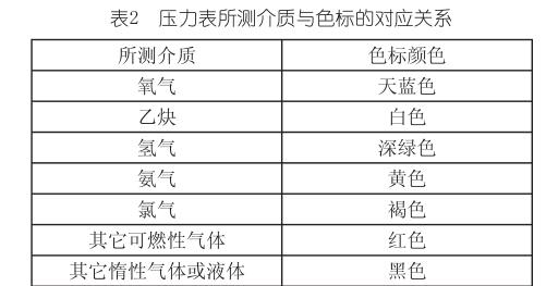 另外,根據(jù)壓力表所測(cè)介質(zhì)不同,壓力表應(yīng) 采用不同的色標(biāo),并注明所測(cè)介質(zhì)的名稱,詳見(jiàn) 表2。