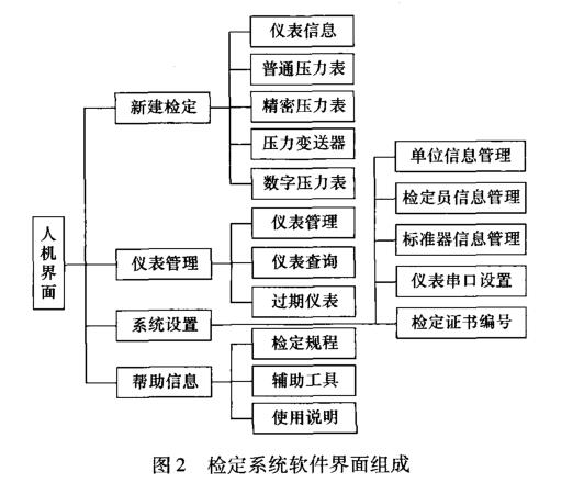 系統(tǒng)軟件以Visual C + + 6. 0為開發(fā)平臺(tái),采用基 于ODBC的數(shù)據(jù)庫(kù)管理系統(tǒng),數(shù)據(jù)庫(kù)系統(tǒng)采用Mi-crosoft Accesso系統(tǒng)軟件可實(shí)現(xiàn)壓力數(shù)據(jù)的自動(dòng)米集 和自動(dòng)保存,并根據(jù)檢定儀表信息智能判斷被檢儀表 是否合格,能自動(dòng)生成并打印檢定原始記錄和檢定證 書,能建立被檢壓力表信息,可查詢歷史檢定記錄,便 于壓力表檢定信息管理,原始記錄模板以及檢定證書 模板可在Word中自由編輯,靈活方便。圖2所示為 本文所述檢定系統(tǒng)軟件界面組成框圖,采用多級(jí)菜單 模式實(shí)現(xiàn)儀表的新建檢定、儀表管理、系統(tǒng)設(shè)置、幫助 信息等功能。
