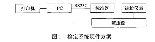 檢定系統(tǒng)標(biāo)準(zhǔn)器采用HX601智能壓力校驗(yàn)儀,液 壓源可采用便攜式HX671手動(dòng)液壓源(0 ~60 MPa), 便于隨I&應(yīng)急檢定;也可采用固定液壓臺(tái),各安裝一臺(tái) 工作穩(wěn)定、性能優(yōu)良的正壓泵(SC-YBS-F2)與一臺(tái)真 空泵(SC-YBS-F1),實(shí)現(xiàn)壓力表正壓與負(fù)壓的集中檢 定。圖1所示為檢定系統(tǒng)硬件方案組成框圖。
