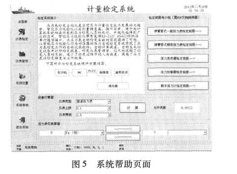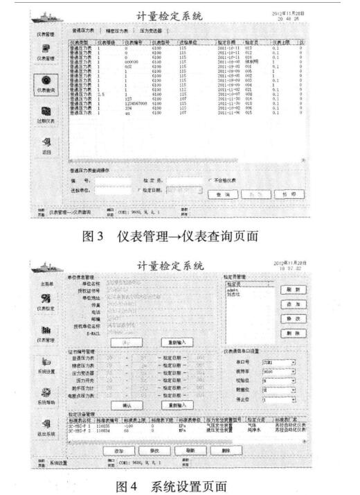 新建檢定菜單下主要包括儀表信息、普通壓力表、 精密壓力表、壓力變送器、數(shù)字壓力表等頁(yè)面;其中儀 表信息頁(yè)面主要用于被檢儀表基本信息的填寫、檢定 參數(shù)設(shè)置及標(biāo)準(zhǔn)器的選擇;其他頁(yè)面則主要用于各型 壓力表的具體檢定操作。儀表管理實(shí)現(xiàn)未檢儀表信息 的錄人、已檢儀表信息的查詢及過期儀表查詢等,圖3 所示為儀表管理菜單下的儀表査詢頁(yè)面。圖4所示為 系統(tǒng)設(shè)置頁(yè)面,實(shí)現(xiàn)檢定單位、檢定員、標(biāo)準(zhǔn)器、標(biāo)準(zhǔn)器 串口、證書編號(hào)等信息管理。圖5所示為系統(tǒng)幫助頁(yè) 面,可提供常用檢定規(guī)程查詢、誤差計(jì)算及單位換算 等。