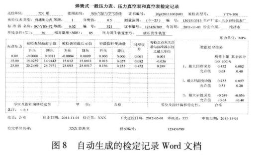 ③后續(xù)處理。針對(duì)軟件頁(yè)面中的操作部分,耑要 判斷零位、指針偏移穩(wěn)定性及外觀迠否合格,并自動(dòng)給 出檢定結(jié)論,錄人核審人員及各種時(shí)間后點(diǎn)占保存數(shù) 據(jù)按鈕實(shí)現(xiàn)檢定數(shù)據(jù)的保存。圖7所示為儀表筲珂的檢定數(shù)據(jù)記錄與處理頁(yè)面,點(diǎn)擊打印報(bào)表按鈕即可打 印檢定記錄并生成檢定證書,如圖8所示。