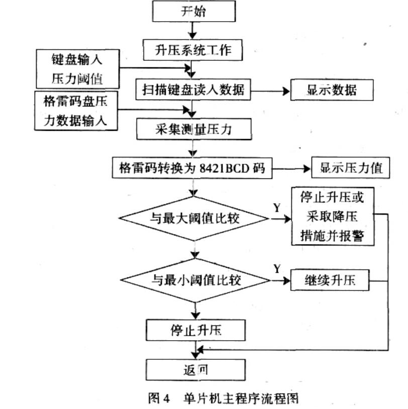用低電平掃描鍵盤(pán),對(duì)P1 口的高四位輪流輸入低電平,同時(shí)單片機(jī)讀低 四位是否有低電平,有則可判斷其按鍵位置,讀入相應(yīng)的數(shù)值。鍵盤(pán)輸入 的是壓力的上、下限閾值,以供比較判斷壓力是否超標(biāo)。LCD顯示器可直 接顯示鍵盤(pán)輸入的數(shù)值。初始化完成后單片機(jī)從壓力數(shù)據(jù)采集電路上讀 取格雷碼數(shù)據(jù),把每個(gè)口讀取的數(shù)據(jù)加以處理。將格雷碼數(shù)據(jù)轉(zhuǎn)換為 8421BCD碼,轉(zhuǎn)換也可由硬件完成,但軟件實(shí)現(xiàn)起來(lái)較為簡(jiǎn)便、經(jīng)濟(jì),編 程采用查表的方法就可以實(shí)現(xiàn)。在系統(tǒng)工作時(shí)LCD顯示器顯示運(yùn)行時(shí)的 壓力數(shù)值,顯示用單片機(jī)的串行口輸出數(shù)據(jù)。最后將實(shí)測(cè)的壓力數(shù)據(jù)與 鍵入的上、下限閾值進(jìn)行比較,壓力較低時(shí)低于閾值),輸出升壓的控制 信號(hào)及報(bào)警信號(hào);壓力較高時(shí)高于閾值),輸出降壓的控制信號(hào)及報(bào)警 信號(hào)。軟件的工作過(guò)程是始終循環(huán)檢測(cè)、比較、顯示及輸出,該系統(tǒng)是實(shí)時(shí)的測(cè)量與控制過(guò)程。