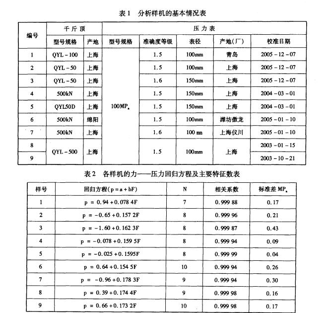 我們收集了屬于 2003 - 04 -14 ~ 2005 -12 - 27 期間校準(zhǔn)的9臺(tái)千斤頂、壓力表力值測(cè)力系統(tǒng)的計(jì)量 檢定資料,考察了它們的示值線性相對(duì)性誤差,示值 重復(fù)性相對(duì)性誤差,示值穩(wěn)定性相對(duì)誤差。(檢測(cè)系 統(tǒng)的進(jìn)回程誤差也會(huì)影響地基靜載荷試驗(yàn)力值的準(zhǔn) 確度,但目前的檢定單位都沒(méi)有這方面的資料)這9 臺(tái)測(cè)力系統(tǒng)都由一體式起重千斤頂和一般壓力表組 成,千斤頂?shù)膶?shí)際工作壓力在77 ~88MPa間,壓力表 的分度值2MPa,基本情況如下表1所示,檢定所得 力——壓力回歸方程如表2所示。