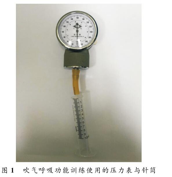 訓練方法將壓力表(上海醫(yī)療器械股份 有限公司)一端連接10 mL注射器的空筒部分(圖 1),指導患者進行1次正常的深吸氣,隨后將空筒頭 端含于口中,盡最大的力量將肺內(nèi)的氣體吹出。壓 力表指針達到或超過30 mmHg(1 mmHg = 0. 133 kPa)時視為1次成功的吹氣呼吸功能訓練。在保 證沒有漏氣的情況下,依照此法訓練多于5次,過程 約3?5 min。 由同一護士負責指導所有患者的訓 練過程,訓練結(jié)束后對患者不進行其他操作。
