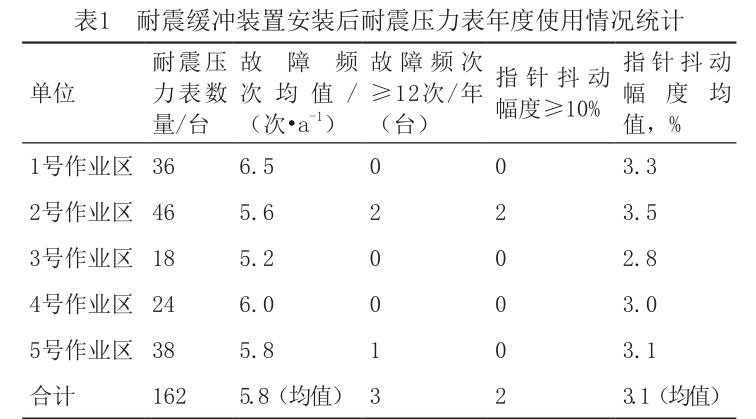 通過現(xiàn)場試驗(yàn),可以看出:安裝儀表減震緩沖裝置 后,儀表故障頻繁和計(jì)量不準(zhǔn)現(xiàn)象得到明顯改善,首先 是儀表故障周期得到明顯延長,平均故障周期可達(dá)50~70 天;其次是儀表指針抖動幅度明顯變小,平均抖動幅度僅 為2.6%~3.9%,大大提高了計(jì)量的準(zhǔn)確性。